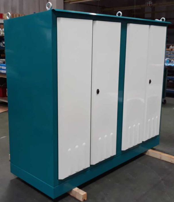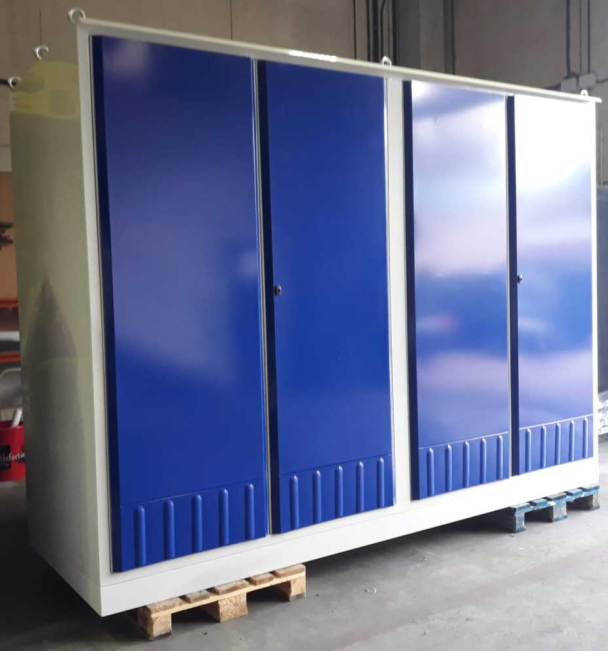 construido en Acero Galvanizado en frio, con puertas empotradas + módulos embellecedores exteriores con rejillas de ventilación homologadas, acabado en colores normalizados.
